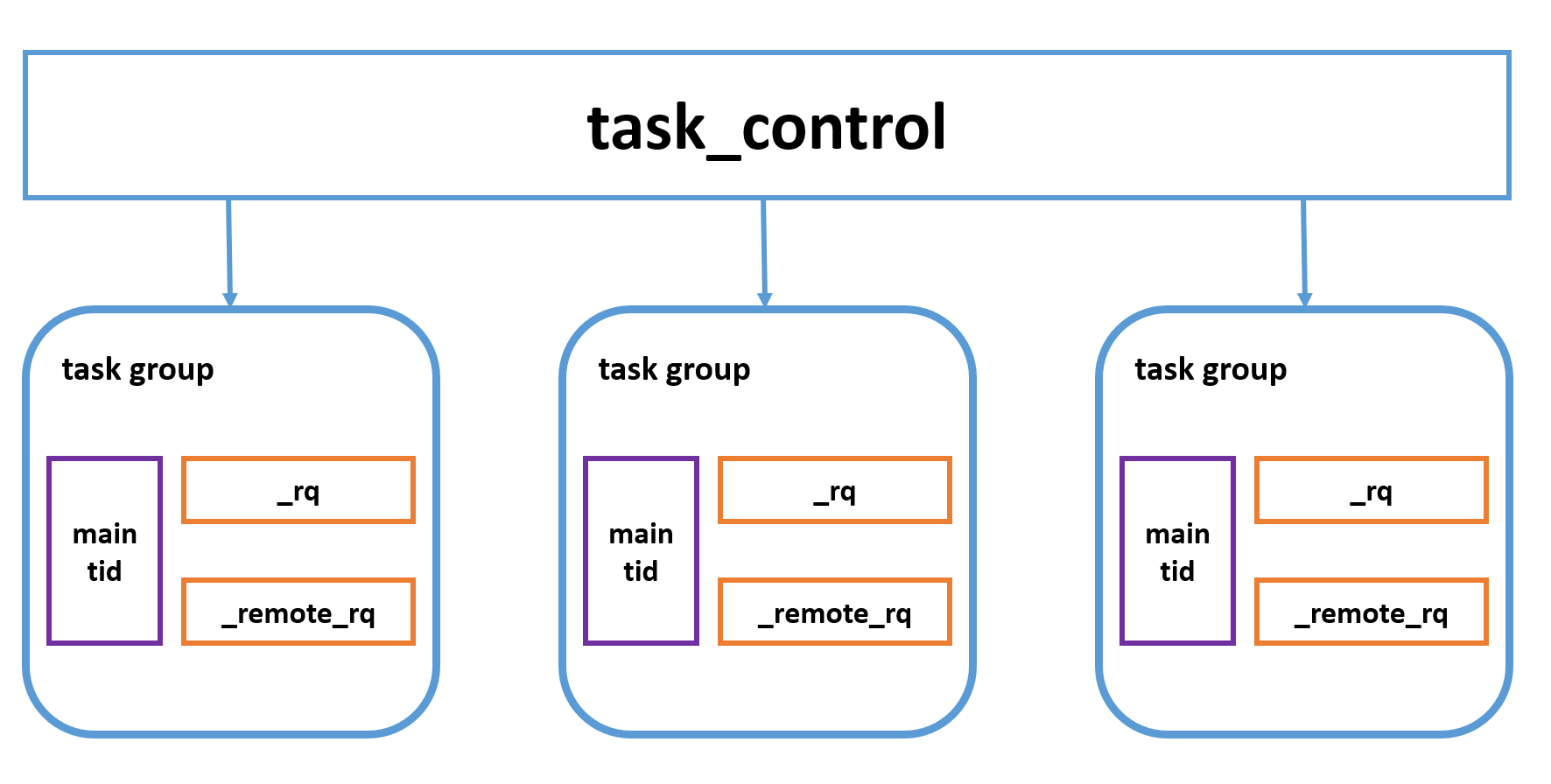 TaskGroup is responsible for scheduling and executing kthreads. Each TaskGroup corresponds to one pthread and contains two execution queues: _rq and _remote_rq, which store pending kthreads. Kthreads created by other kthreads are placed in _rq, while kthreads created by pthreads are placed in _remote_rq. TaskControl is a global singleton that manages multiple TaskGroup instances internally.