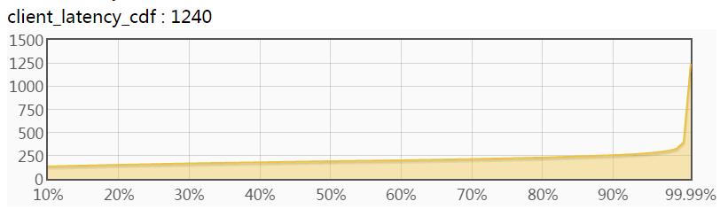 下图是分位值的CDF,横轴是比例(排序位置/总数),纵轴是对应的分位值。比如横轴=50%处对应的纵轴值便是50%分位值。如果系统要求的性能指标是"99.9%的请求在xx毫秒内完成“,那么你就得看下99.9%那儿的值。