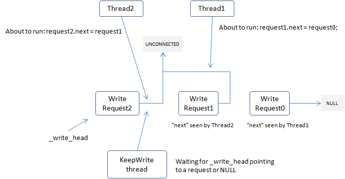 这套方法可以让写竞争是wait-free的,而获得写权利的线程虽然在原理上不是wait-free也不是lock-free,可能会被一个值仍为UNCONNECTED的节点锁定(这需要发起写的线程正好在原子交换后,在设置next指针前,仅仅一条指令的时间内被OS换出),但在实践中很少出现。在当前的实现中,如果获得写权利的线程一下子无法写出所有的数据,会启动一个KeepWrite线程继续写,直到所有的数据都被写出。这套逻辑非常复杂,大致原理如下图,细节请阅读socket.cpp
