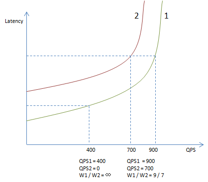 - 根据分流公式又有:W1 / W2 = QPS1 / QPS2 * (L2 / L1)。