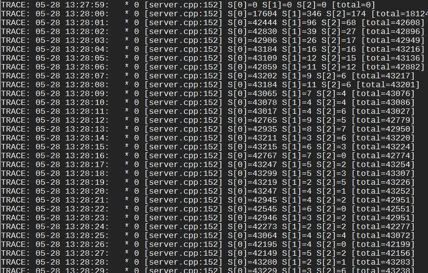 我们用一个例子来看一下具体的分流过程。启动3台server,逻辑分别是sleep 1ms,2ms,3ms,对于client来说这些值就是延时。启动client(50个同步访问线程)后每秒打印的分流结果如下: