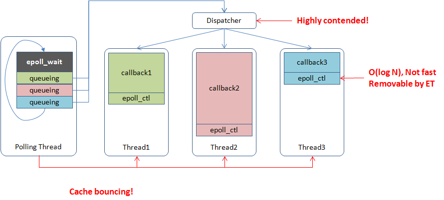 当event dispatcher把任务递给worker线程时,用户逻辑很可能从一个核心跳到另一个核心,并等待相应的cacheline同步过来,并不很快。如果worker的逻辑能直接运行于event dispatcher所在的核心上就好了,因为大部分时候尽快运行worker的优先级高于获取新事件。类似的是收到response后最好在当前核心唤醒正在同步等待RPC的线程。